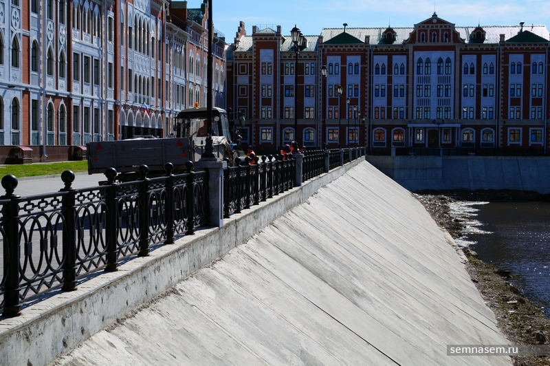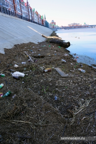Это набережная Малой Кокшаги за дворцами спорта. Характер местного мусора местами отражает специфику стоящих рядом сооружений.