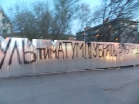 7 мая жители собрались вновь. Были предложения снести забор. Клабуков утверждает, что попросил жителей этого не делать. Тогда один из них написал на заборе краской «Ультиматум!!! Убрать забор до 8 мая! Сквер вернуть городу!», а с другой стороны — «Соловьев, верни сквер городу!» (имеется в виду глава Удмуртии Александр Соловьев — ОВД-Инфо). После этого было решено записать видеообращение к главе Удмуртии. Клабуков сделал запись, на которой жители объявили, что требуют снести забор до 9 мая, иначе они сами примут меры.