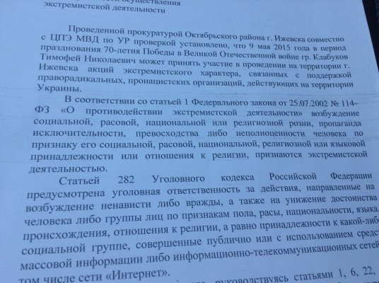 Клабукову же, помимо этого, вручили еще и прокурорское предостережение. В нем было сказано, что «проведенной прокуратурой Октябрьского района г. Ижевска совместно с ЦПЭ МВД УР (Удмуртской Республики — ОВД-Инфо) проверкой установлено, что 9 мая 2015 года в период празднования 70-летия Победы в Великой Отечественной войне гр. Клабуков Тимофей Николаевич может принять участие в проведении на территории г. Ижевска акций экстремистского характера, связанных с поддержкой праворадикальных пронацистских организаций, действующих на территории Украины».