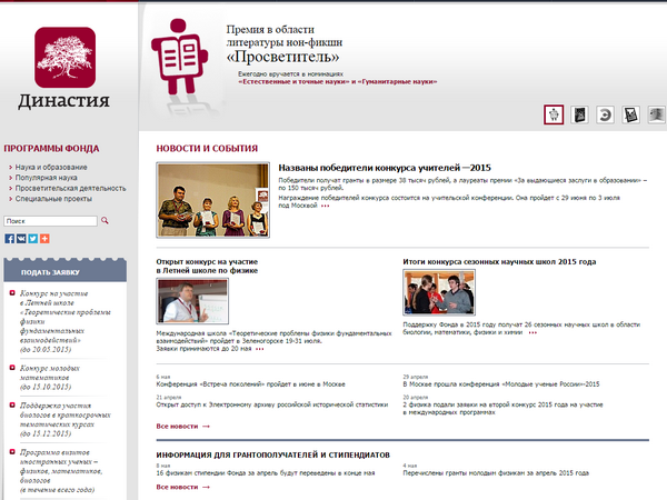 Фрагмент страницы сайта Фонда "Династия" Один из ключевых российских институтов поддержки науки, образования и просвещения - Фонда некоммерческих программ «Династия» оказался под угрозой – рассматривается вопрос о его внесении в реестр НКО-«иностранных агентов». В поддержку Фонда уже выступила в письме министру юстиции РФ Комиссия общественного контроля в сфере науки.