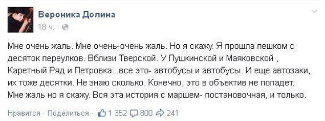 Наконец автор и исполнитель песен Вероника Долина в Facebook вечером 10 мая рассказала о большом числе пассажирских автобусов, которые она увидела в переулках вблизи Тверской — главной улицы, по которой прошло шествие «Бессмертного полка». Запись Вероники Долиной, в которой она указывает на участие массовки среди участников шествия, теперь не доступна, однако сохранились ее скриншоты.