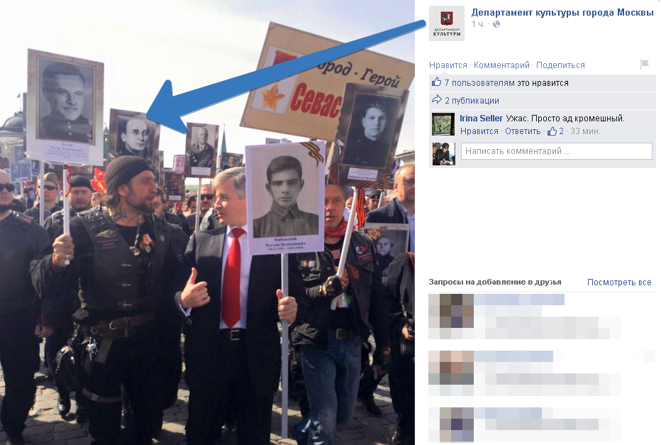 Так, на странице в Facebook Департамент культуры Москвы 11 мая опубликовал фотографии, на которых за спиной столичного министра культуры Александра Кибовского и его соседа байкера Александра «Хирурга» Залдостанова, участвующих в шествии «Бессмертного полка», стоит человек с портретом Лаврентия Берии— ближайший соратник председателя Совета министров СССР Иосифа Сталина. Лично в войне против нацистской Германии Берия не участвовал, а 1953 году его расстреляля как одного из главных организаторов политических репрессий..