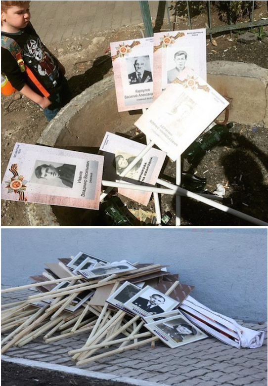 Накануне известный блогер Андрей Мальгин опубликовал фотографии из Twitter, на которых плакаты с шествия «Бессмертного полка» свалены в груду или даже выброшены вместе с мусором в цилиндрическую урну.