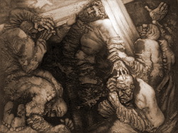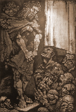 Самой заметной весенней художественной выставкой в Пскове стала выставка «Осознанная реальность» Вячеслава Михайлова. Три зала Псковского музея-заповедника были отведены под живопись и графику одного из ведущих петербургских художников. Рассматривая работы Михайлова, написанные на евангельские сюжеты, я подумал о том, что где-то не так давно с этими людьми уже встречался. И это было явно не на улицах Иерусалима. Ну, конечно же, я видел этих людей в фильме Алексея Германа «Трудно быть Богом». [1] На таких лицах написано то, что обычно на лицах не пишут и что стараются спрятать как можно глубже. Но некоторые художники добираются до самых глубин и потом показывают это всему миру. В случае с Вячеславом Михайловым это не преувеличение, имея в виду, что его выставки уже много лет проходят в Италии, Германии, Нидерландах, Великобритании, США, Китае…