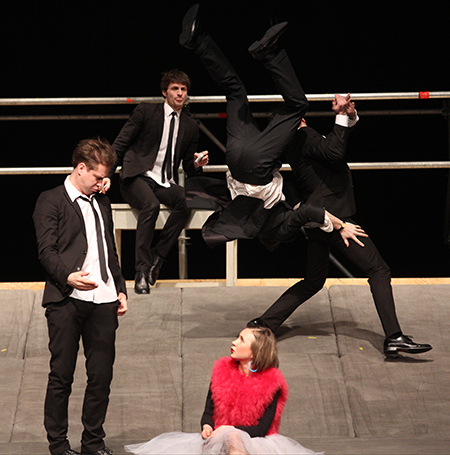 © Пресс-служба БДТ/ Стас Левшин По обыкновению буйная во хмелю молодежь превосходно проявила себя: Виктор Княжев (бывший Рахметов) вот уже второй раз доказывает свое право на монологи, Варвара Павлова вправе гордиться своей сценогенией (хотя уверенная неземная поступь той, чье имя Красота, давалась ей проще алкогольной абстиненции). Руслан Барабанов — самый упрямый из менеджеров на мальчишнике — напомнил о том, что в театре оценки и паузы могут быть куда красноречивее, а подчас и остроумнее слов. Юлия Дейнега блистала в роли проститутки по имени Роза — она была самой трезвой и уморительно серьезной среди всех этих пьяниц, и ее неутолимая жажда духовных откровений была начисто лишена физиологических мотивировок. Не нашлось никого, кто бы первым кинул камень в этого грозно нахохлившегося маленького розового воробья, отстаивающего чувство собственного достоинства, отбиваясь от нахалов внушительных размеров цветком. Понятно, что Христос в итоге должен был явиться (или привидеться) именно ей, проститутке, а стало быть, неподъемный финал достался именно молодой актрисе, которая с честью вышла из положения.