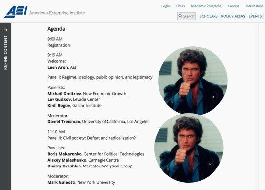 By the way, folks, a TV crew from Russia-1 is here. Thatʼs Dmitry Kiselyovʼs outfit. Theyʼre almost certainly here to get some footage of Russiaʼs great minds rubbing elbows at an American neoconservative think tank. Smile for the camera, gentlemen!