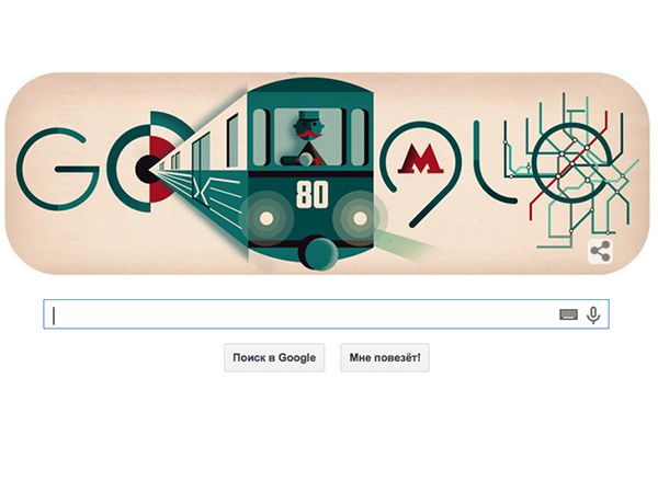 Поисковик Google создал дудл в честь 80-летия московского метрополитена. На картинке изображен выезжающий из тоннеля усатый машинист поезда с цифрой 80. Дудл доступен только для российских пользователей, сообщается на сайте поисковика.