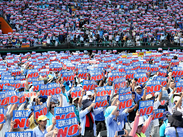 Участники акции протеста, которая прошла на бейсбольном стадионе в городе Наха (административный центр Окинавы) приняли резолюцию, призывающую к закрытию авиабазы Футэмма и отмене плана ее передислокации.