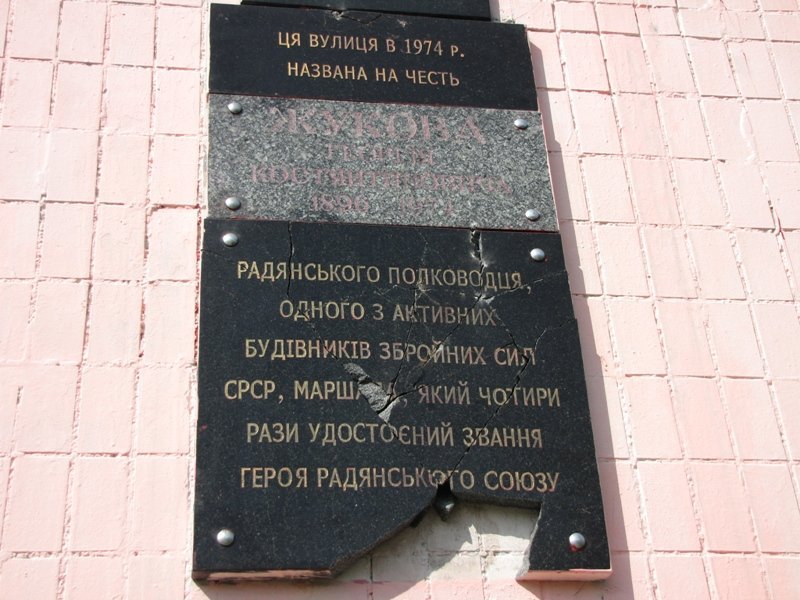 В Киеве на улице Жукова молодые люди в масках разбили мемориальную доску, установленную в честь маршала Советского Союза Георгия Жукова, сообщает «Интерфакс».