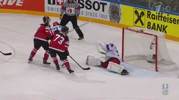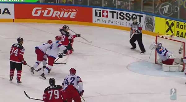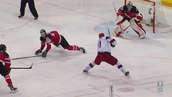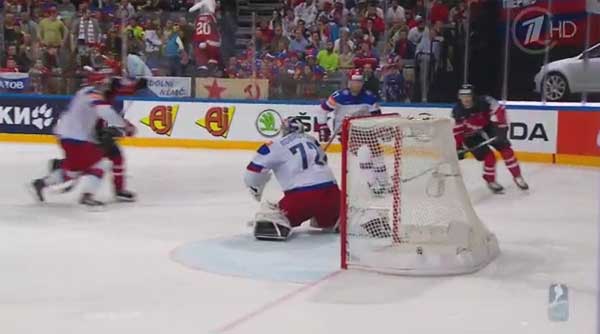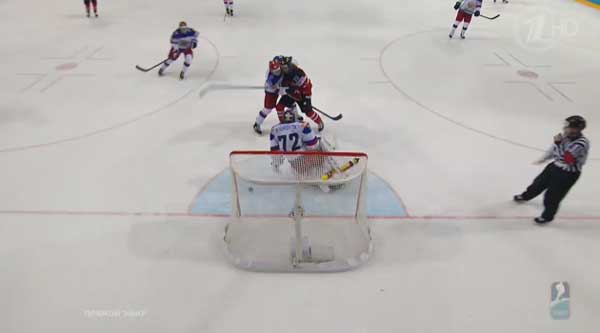 Сборная Канады забрасывает шайбу в ворота сборной России - 1:0.