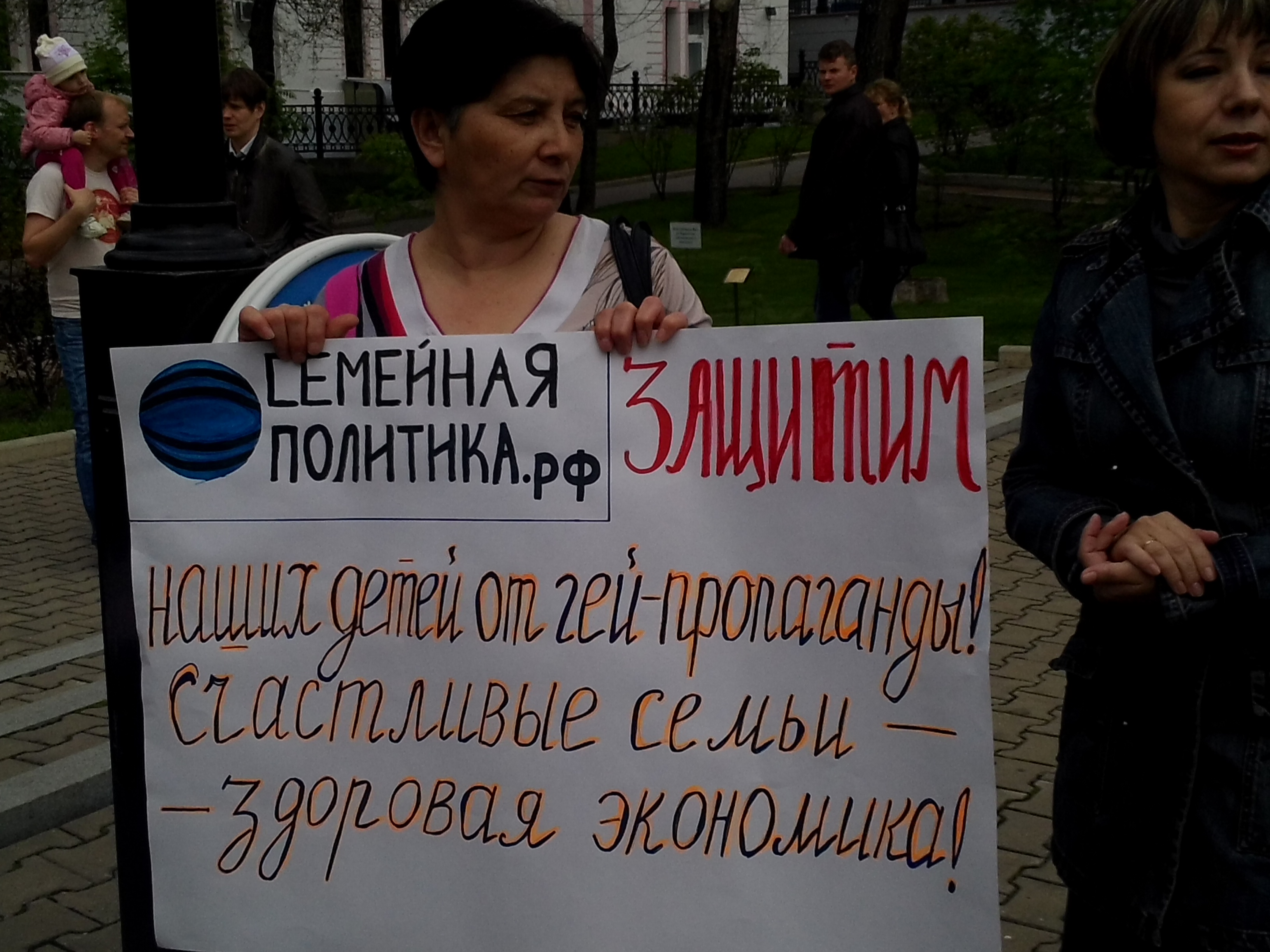 Чуть позднее в центре Хабаровска прошла акция "в поддержку традиционных ценностей". Ее участники держали плакаты с призывами "защитить детей от гей-пропаганды", а также подписали резолюцию, в которой призывают "к уважению суверенитета российского народа и приглашают все организации и людей, осознающих ответственность за невинность детей и их права, естественную семью и права родителей, выступить в поддержку России".