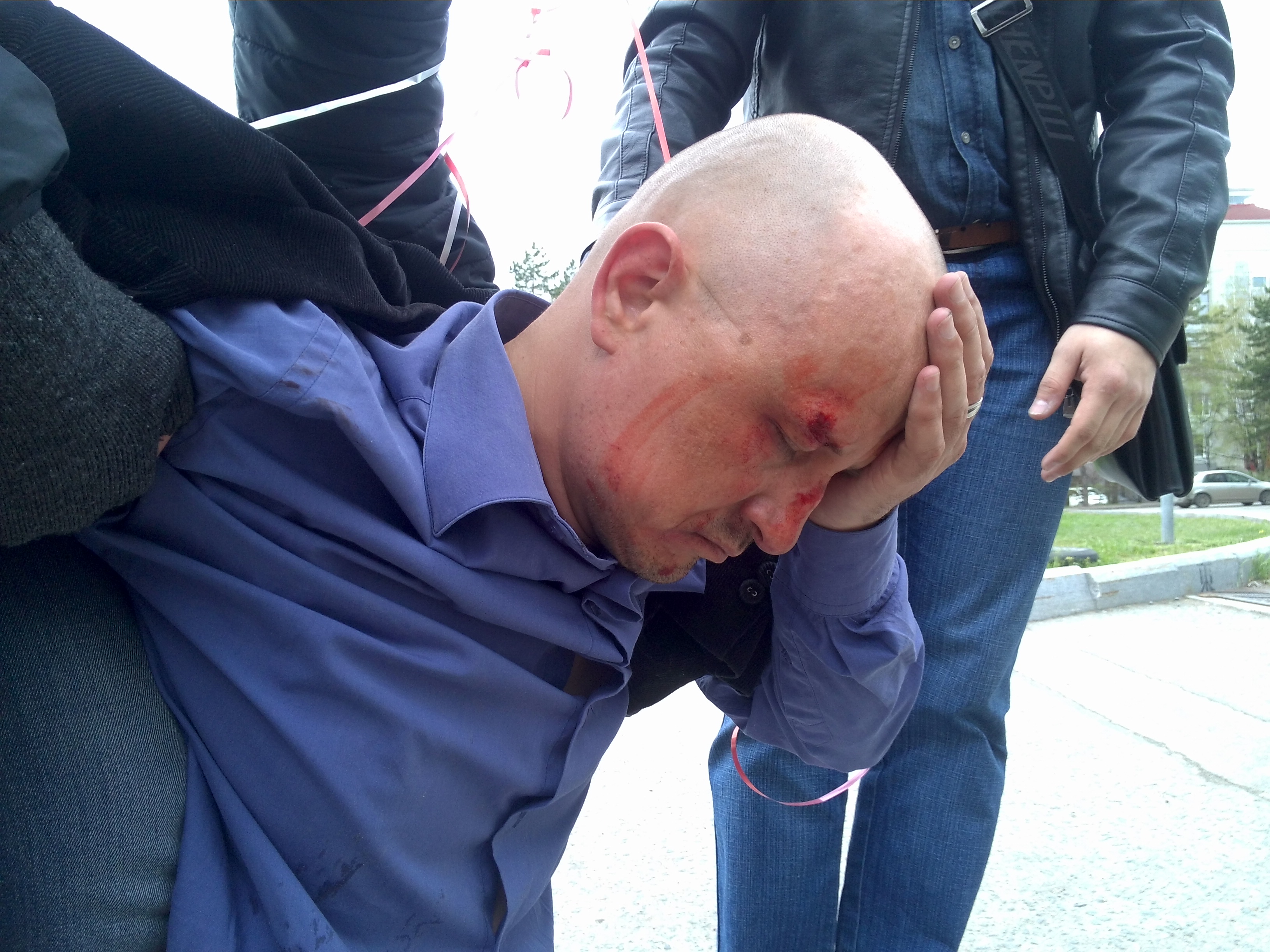 На Александра Ермошкина напали почти сразу после того, как он вышел из машины, – находившимся с ним рядом людям прыснули в лицо из газового баллона, а самого активиста ударили по голове, после чего он упал