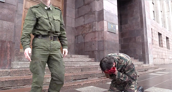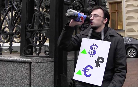 © арт-движение «Синий Всадник» «Умылся кровью у ФСБ» Речь, разумеется, о Рене Жираре, исследовавшем скандальность миметического желания, гонительские стереотипы, виктимные признаки и многовековую процедуру люстрации, отменяемую лишь пришествием Христа. По Жирару, жертва требуется всегда, когда уровень насилия в обществе зашкаливает, и это позволяет нам по-новому понять некоторые акции «Синего всадника». Что, если поедание (принесение в жертву) сторублевки — вовсе не скорбь по съежившейся вдруг покупательной способности, вовсе не упрек недоработавшему руководству Центробанка, но окольное указание на запредельный уровень взаимной ненависти в стране? При этом акции Олега Басова и Ко нельзя назвать безрассудными — в них, напротив, есть циничное спокойствие утвержденного свыше ритуала. Жертва выбирается среди ближних, она всегда слаба и не способна оказать серьезное сопротивление. Нет ничего легче, чем пинать Ленина после развала СССР в 1991-м, «Единую Россию» после парламентских выборов 2012-го, рубль после девальвации в декабре 2014-го. Стратегия «Синего всадника» всегда миметически подражает стратегии власти, также разыскивающей внутреннего врага среди отличающихся виктимными признаками категорий населения, предполагающей их триумфальное изгнание, метафизическое (а подчас и физическое) уничтожение ради сохранения порядка в стране. Будучи умными и адекватными людьми, Басов, Авилов и Думицкая отстраненно и насмешливо обыгрывают запущенный Кремлем тренд, в котором православие сводится к языческому поиску искупительной жертвы во имя России (не случайно первым названием группы было «Яростные святоши»); но, честные перед собой, верящие в собственное «скоморошество», участники «Синего всадника» в то же время невольно оказываются манифестантами консервативных стратегий — говорящими свое слово миру искусства посредством упомянутых акций и вопреки их исходным, вполне демократичным, интенциям.