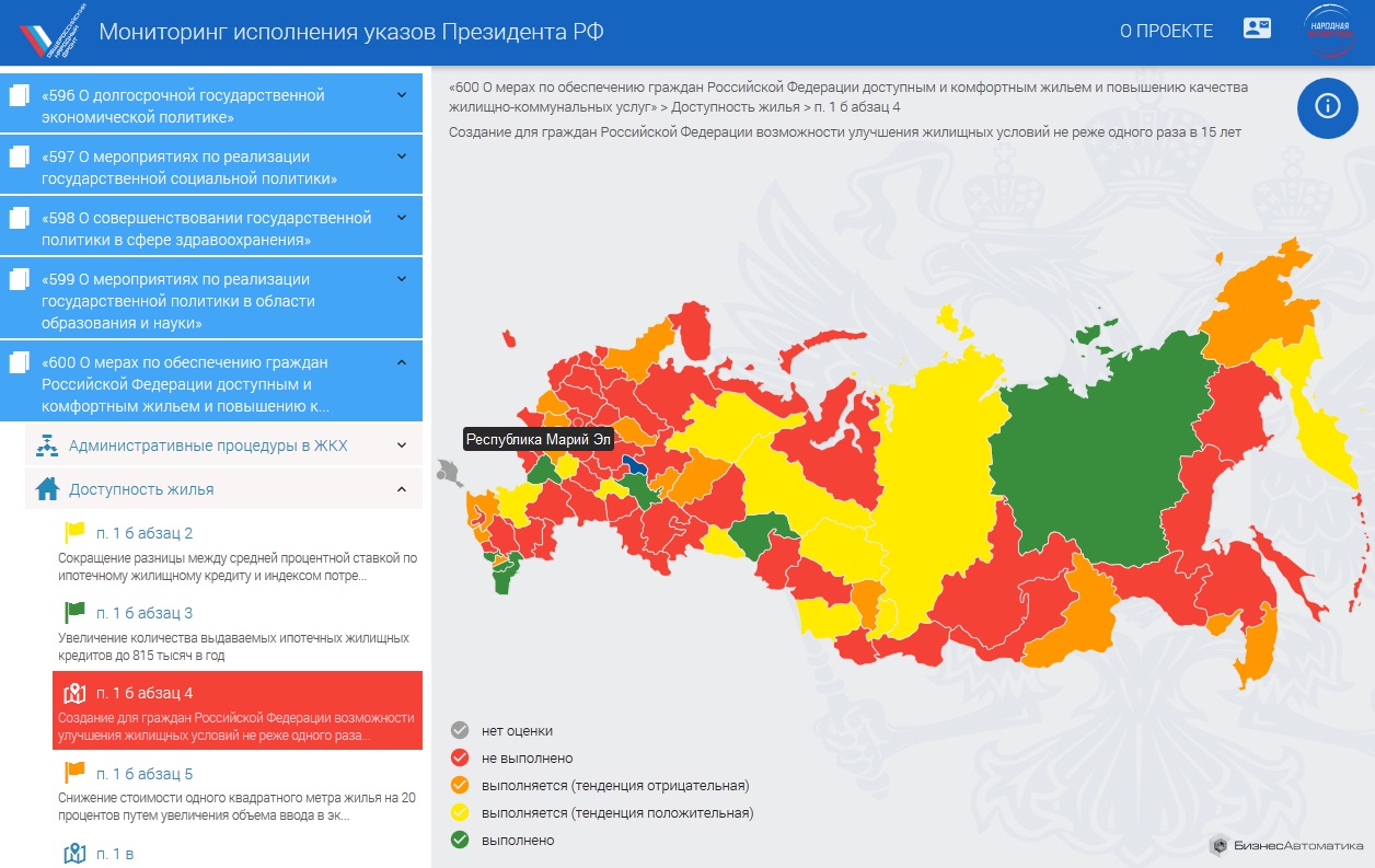 Один из пунктов многочисленных майских путинских указов касается увеличения доли заемных средств в общем объеме капитальных вложений в инфраструктуру ЖКХ до 30% — он властями Марий Эл не выполнен. Судя по оценкам экспертов ОНФ, в Марий Эл наблюдается отрицательная тенденция в сфере улучшения качества предоставляемых услуг ЖКХ, в том числе путем увеличения конкуренции, и не обеспечивается специальное формирование условий ипотечного кредитования отдельных категорий граждан, предусматривающее меры господдержки.