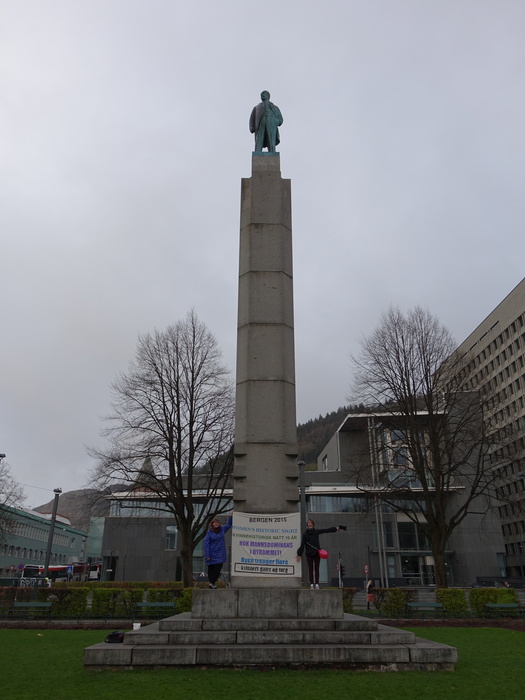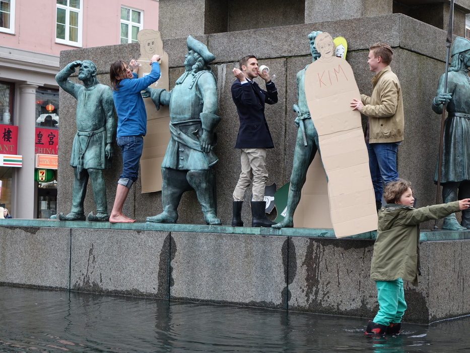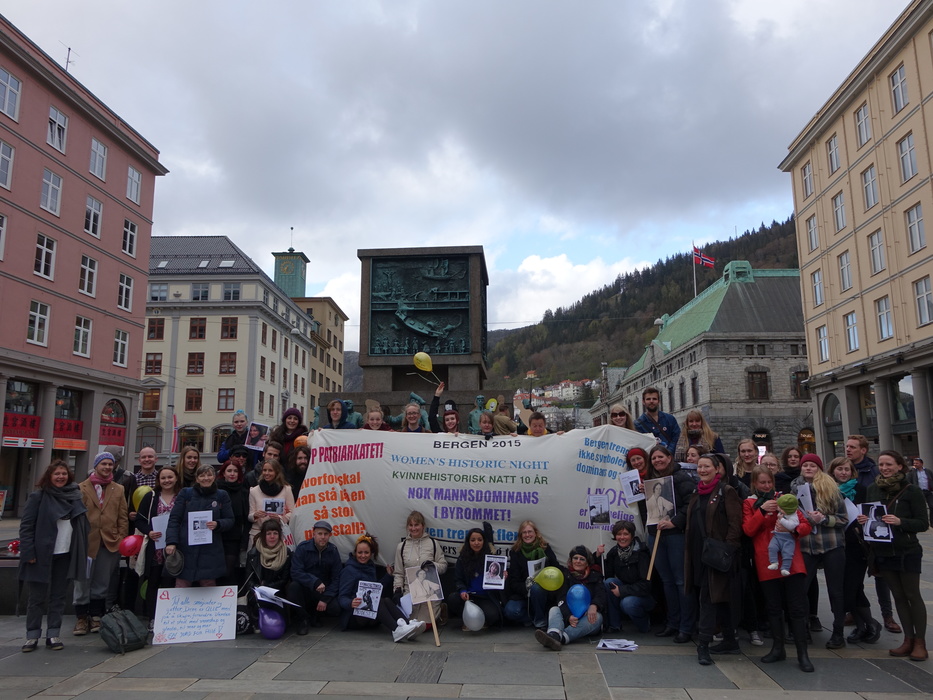 На празднование десятилетнего юбилея бергенской "Женской исторической ночи" 8 мая пришло беспрецедентное количество активистов из разных партий и инициатив, хотя по-прежнему преобладали анархисты. В 2014 году в Бергене плакаты клеили 14 человек, и мы считали это большой удачей, а через год на площади собралось 60 человек и столько же добавилось на вечерней акции в клубе. Второй кандидат в списке "F!" надел резиновые сапоги и полез на военно-морской фонтан на центральной площади, чтобы поучаствовать в установке восьми женских картонных монументов рядом с двенадцатью мужскими. Участники феминистской ночи сфотографировались с баннером, который потом повесили на памятник первому премьер-министру независимой Норвегии Кристиану Михельсену, или "фаллос-монумент". Дизайн баннера и слоганы для него придумала талантливая художница Лине Фресвик. "Хватит мужского доминирования в городском пространстве!", "Городу нужно больше женских улиц и площадей", "Стоп патриархат!", "Почему он стоит на таком большом пьедестале?", "Бергену не нужны символы доминирования и насилия", "Где памятники женщинам?" – эти лозунги видели проходящие мимо "фаллос-монумента" люди.