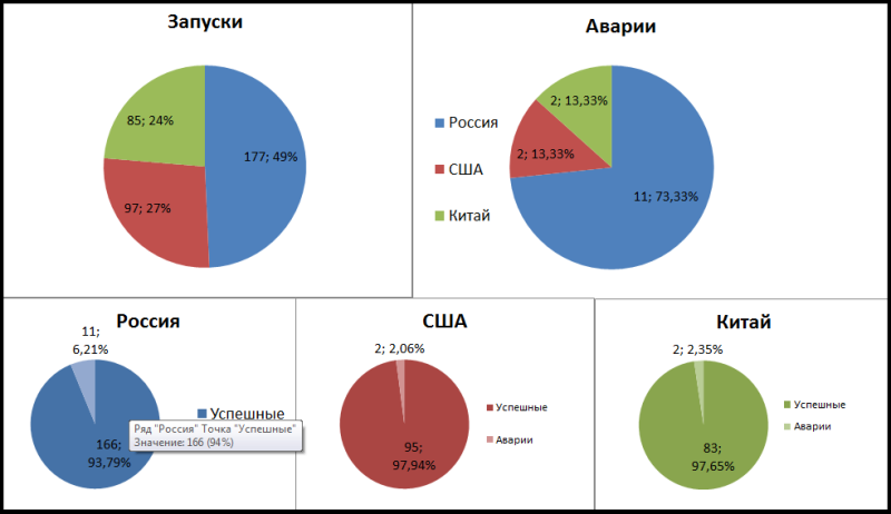 Как видно Россия делает запусков столько же сколько Китай и США вместе взятые, но аварий на неё приходится уже 3/4. Доля аварийных запусков у России практически в 3 раза превышает показатели Америки и Китая.