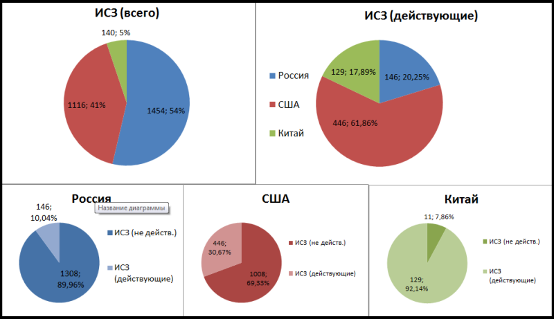 Второй важный показатель, численность искусственных спутников земли (ИСЗ), в таблице ниже приведена численность спутников за все время (к России входят все советские спутники):