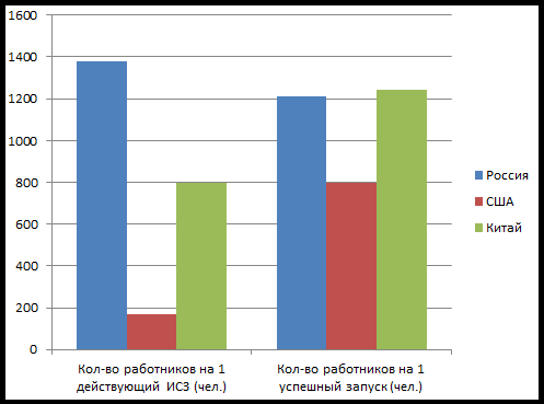 Фактически это показатель производительности труда в космической отрасли, где мы очень сильно уступаем, особенно Америке. Это ни что иное как конкурентоспособность, и при таком подходе в ближайшее время Россия будет вытеснена из космической сферы. Понятно, что надо что-то делать, Госдума на днях приняла проект о создании госкорпорации "Роскосмос", что это даст? На мой взгляд добавит ещё несколько тысяч человек которым надо будет платить зарплату. Получим второй "Роснано", который денег есть много - отдачи никакой.