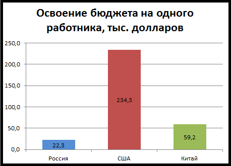 Выходит у нас основная масса космических денег просто проедается многочисленными работниками (предположим среднюю зарплату в 1 тыс. долларов, выходит из 22,3 тыс., 12 тыс. идет на зарплату, а 10,3 тыс. это затраты на материалы, оборудование, технику, технологии. Если допустить, что у китайцев такая же зарплата, то на техническую часть у них остается в 4 раза больше средств).