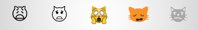 С котиком, который в эмодзи от Apple держится за щечки, тоже вышло недоразумение. Как говорится в пояснении «Консорциума Unicode», он «устал, а не в ужасе». Никаких конкретных предложений по его изменению не поступало, но есть вариант чуть иного начертания — второй в ряду ниже. Впрочем, на этой картинке котик все равно выглядит испуганным.