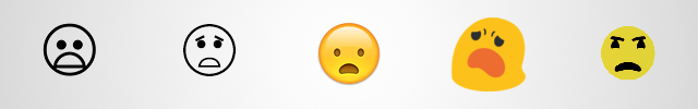 Эмодзи ниже — не шокированный или расстроенный, как может показаться, а хмурый. Официально он называется «нахмурившееся лицо с открытым ртом» («Frowning Face With Open Mouth»). Чтобы прояснить ситуацию, в Unicode предлагают прикрыть смайлу рот и дорисовать угрюмые брови.
