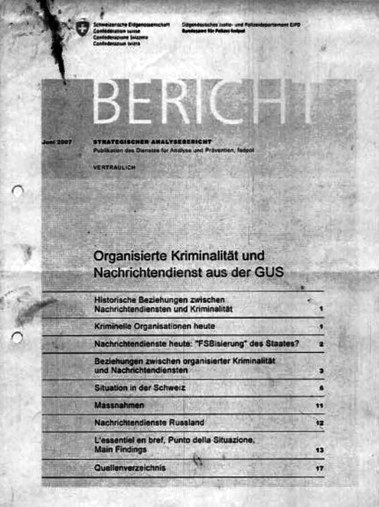 «Различные западные спецслужбы склонны считать, что не только отдельные или бывшие офицеры российских спецслужб вовлечены в криминальную деятельность, но что Спецслужба сама заинтересована в систематическом сотрудничестве», — делается вывод в отчете швейцарской разведки.