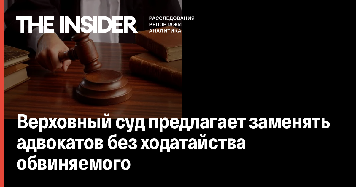 Верховный суд готовит постановление («О применении судами законодательства, обеспечивающего обвиняемому права на защиту»), которое позволит судьям оценивать качество помощи адвоката подсудимому в ходе процесса и заменять его без ходатайства доверителя, пишет «Право.ру» со ссылкой на судью в отставке Сергея Пашина. «Проект вызывает много вопросов. Тут есть нормы, которые не только противоречат позиции Европейского суда по правам человека, но и являются по своей природе определенно дискриминационными. Верховный суд собирается предоставить всем судьям возможность оценивать качество оказания правовой помощи защитника и при необходимости этого адвоката-защитника, если он работает ненадлежащим образом, устранять из процесса. Как прямо написано: без ходатайства доверителя», — заявил экс-судья. Согласно проекту, «если защитник в судебном разбирательстве выполняет свои процессуальные обязанности ненадлежащим образом (например, заявляет о доказанности вины подсудимого который ее отрицает; отказался от участиях в прениях сторон; занял позицию, противоречащую доводам жалобы (возражениям) обвиняемого, и т.п.), вопрос о его замене может разрешаться судом без ходатайства обвиняемого».