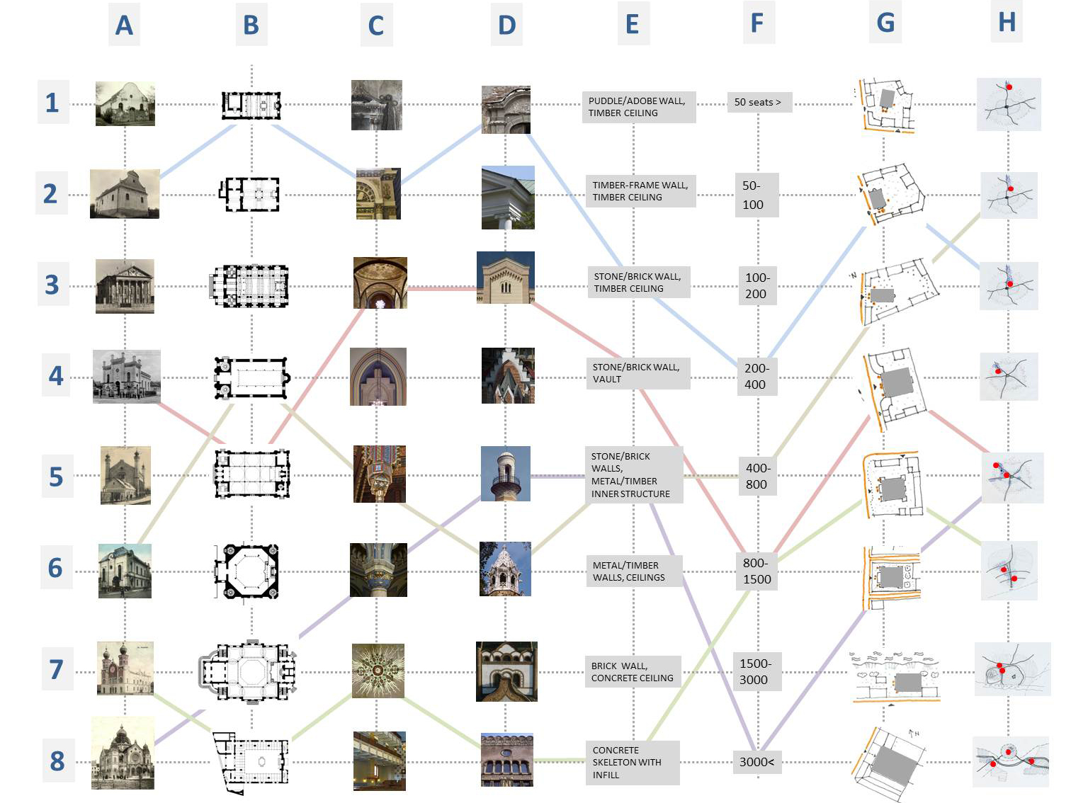 Значимым достижением своего исследования я считаю матрицу со всеми возможными вариантами этих критериев. Все они комбинируются, меняются друг с другом местам, вроде кубика Рубика. Их комбинации говорят о положении еврейской общины в городе, отношении к ним местного населения и властей. Эта борьба напоминает мне перетягивание каната: насколько евреи смогут использовать при строительстве свои культурные элементы и насколько местные жители наведут в ней свои порядки.