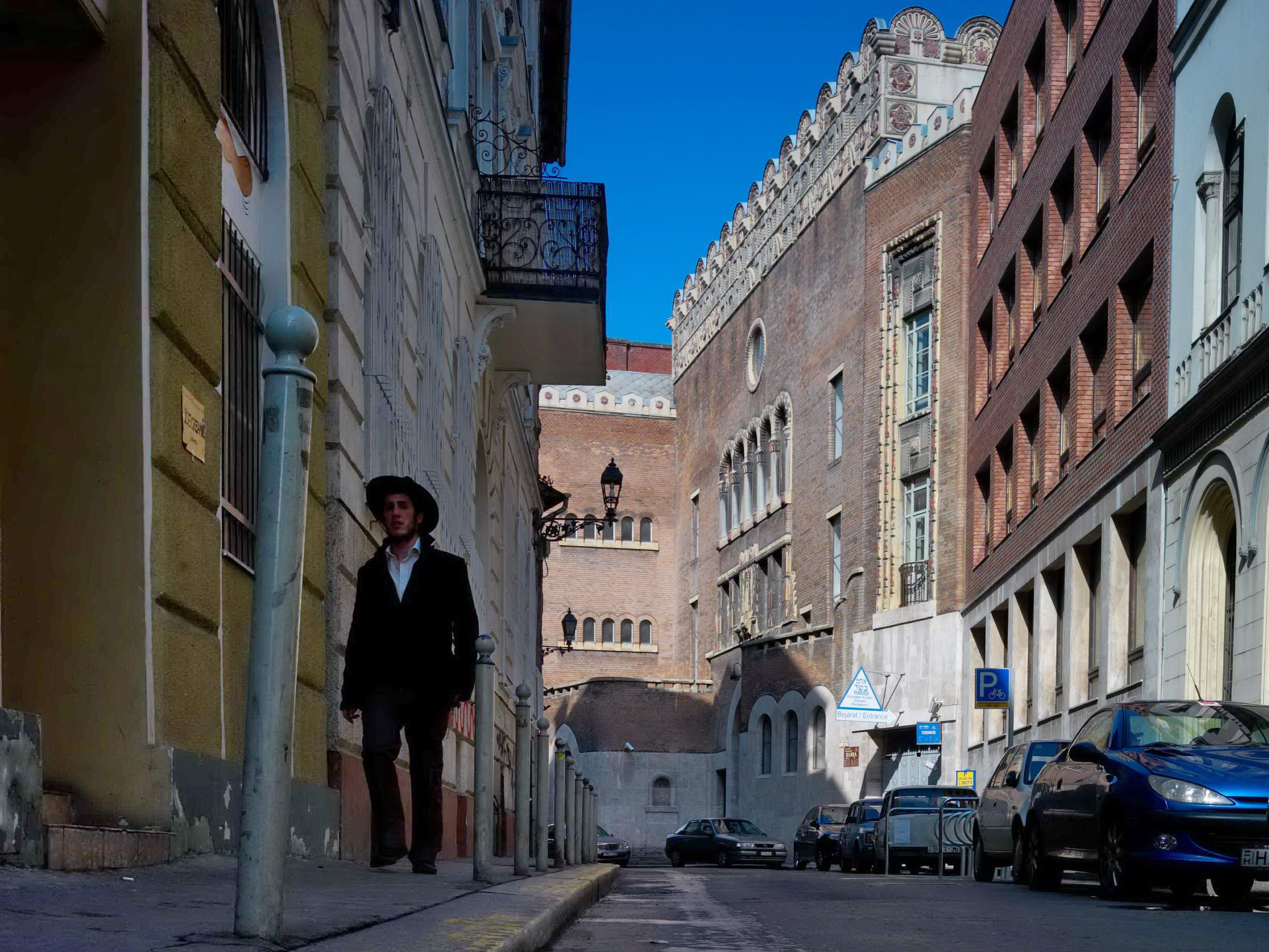 Пожалуй, мой любимый – снимок на улице Казинци в Будапеште. Здесь запечатлена синагога 1902 года – это достаточно современная постройка. С 1944 по 1945 год здесь было еврейское гетто. Синагога, как близлежащий ресторан и двор функционируют, а школа уже нет. Меня заворожила суть этого кадра: евреи смогли образовать такое крепкое ядро прямо в центре Будапешта, что оно не разрушается уже более ста лет. Завершенность фотографии придает ортодоксальный еврей, идущий в этот момент по улице.
