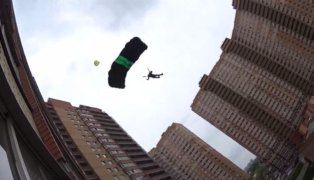 Бейсджампер спрыгнул с крыши 27-этажного дома, который стоит в поселке Мурино Ленинградской области. Он выбросил парашют сразу после прыжка и успешно приземлился во дворе.