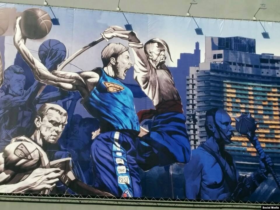 – Так как во мне течет отчасти и украинская кровь, наверное, мне было легче вжиться. Концепция такова: баскетболисты отбрасывают тени в виде силуэтов национальных героев, которые сражались за Украину, и просто героев былин, сказок, которых я решил включить в это панно.