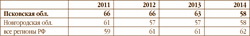 Что в результате получилось? Доля расходов на социальные цели в бюджете Псковской области падала год за годом, в 2014 г. резко снизившись до 58% с помощью «кавалерийской рубки» расходов (таблица 3). В Новгородской области доля расходов на социальные цели такая же, но она устойчива в последние годы, а регионы России в целом тратили больше – 62% в 2014 г. Судя по всему, власти Псковской области хотят быть в числе лидеров бюджетной оптимизации, сокращая число занятых в социальных отраслях и сеть учреждений. Оставшимся работникам можно повысить зарплату в соответствии с указами, благо средний ее уровень по области невысок. Согласно ли с такой политикой население? Видимо, это не имеет значения…