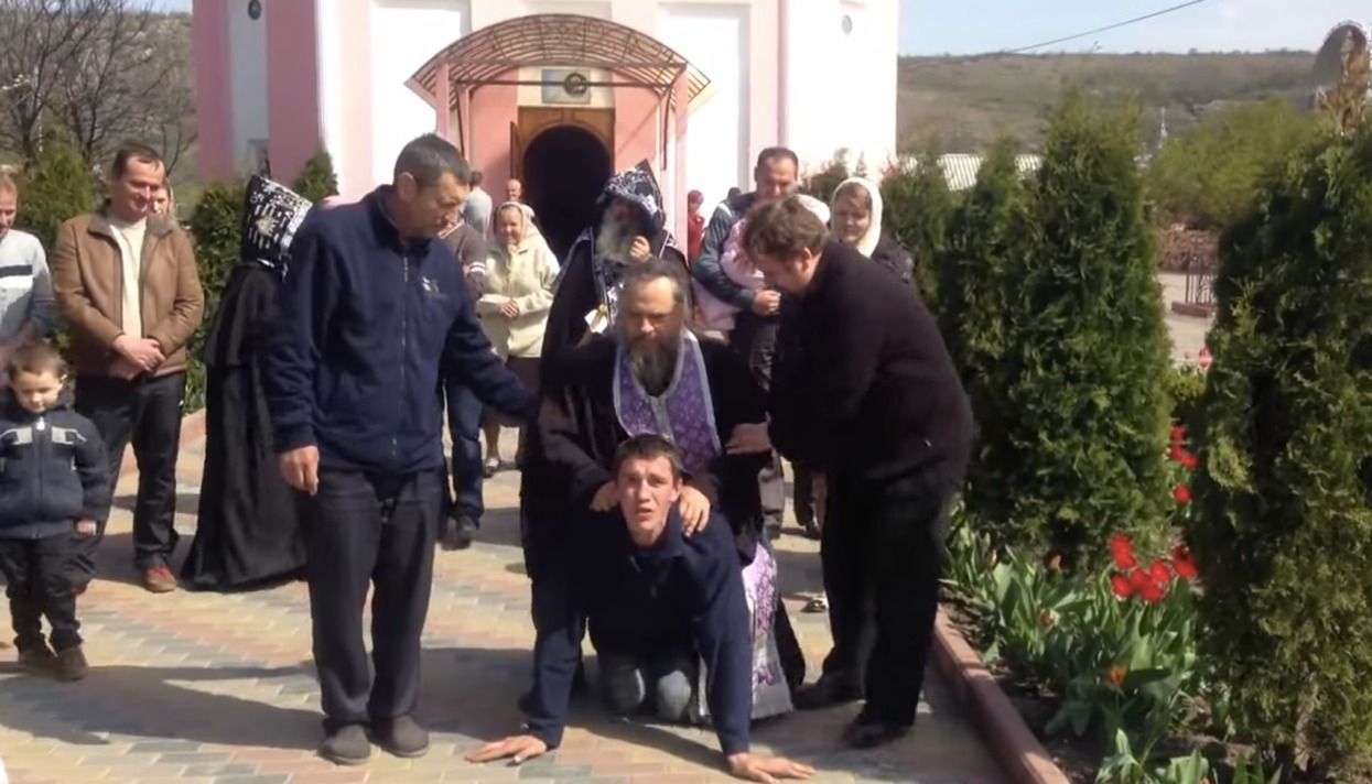 Man possessed by the Devil is saddled by a priest in this strange Transnistrian exorcism