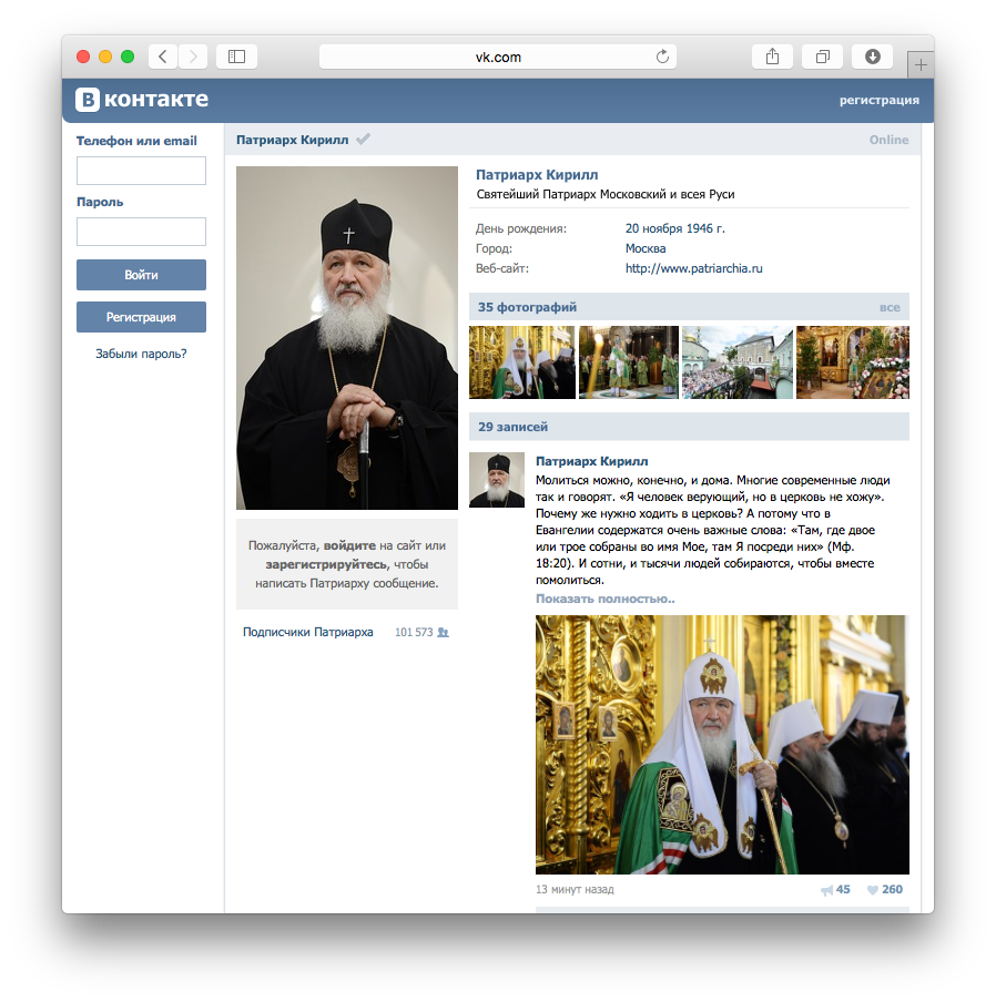 — Так же, как в фейсбуке страницу Святейшего ведет наш отдел — точно так же и «ВКонтакте». Открытие страницы свидетельствует, конечно, о том, какое значение патриарх и Церковь придают новым коммуникационным возможностям. «ВКонтакте» — самая большая русскоязычная сеть, там большинство — наша молодежь. А патриарх все время говорит о важности общения с молодежью. На 1 июня — это чуть больше недели работы — количество подписчиков новой страницы — 100 тысяч. В первые дни в сутки было более миллиона посещений. Такой старт не только я высоко оцениваю, но и руководство «ВКонтакте», с которым мы, конечно, в контакте.
