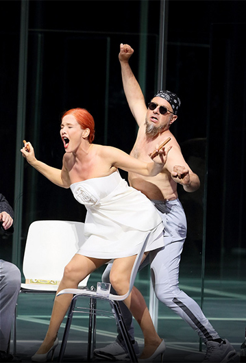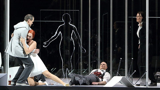 © Bayerischen Staatsoper Как и в другой берговской работе Чернякова — «Воццеке» в Большом, никакой социалки и чернухи в «Лулу» нет. Наоборот, все, что вокруг Лулу и ее отношений с несколькими главными персонажами, стерильно, прозрачно и условно. Декорации (как обычно, черняковские) — минималистичный стеклянный лабиринт, на одной из панелей которого разные руки весь спектакль дорисовывают свою черточку ко все равно неуловимому портрету Лулу. Сквозь этот лабиринт вроде все видно, прятки и подсматривания из-за портьеры отменяются, но он бликует, путает, обманывает (свет — Глеб Фильштинский). Где-то в его глубине недвижная Лулу танцует перед Шёном и его несбывшейся невестой; проносится, ослепляя, полицейская мигалка; из нарядной толпы (костюмы Елены Зайцевой) вылепляется новенькая потенциальная Лулу с той же узнаваемой ярко-рыжей прической и вновь засасывается обратно; выставка застывших мужских и женских тел в одном нижнем белье оформляет последнюю правду финала.