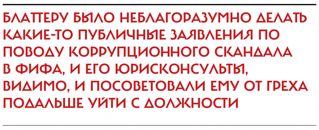 В этом случае Блаттеру было неблагоразумно делать какие-то публичные заявления по поводу коррупционного скандала в ФИФА, и его юрисконсульты, видимо, и посоветовали ему от греха подальше уйти с должности. Но выборы нового президента ФИФА состоятся не раньше декабря. До этого Блаттеру, очевидно, придется прилежно «фильтровать базар».
