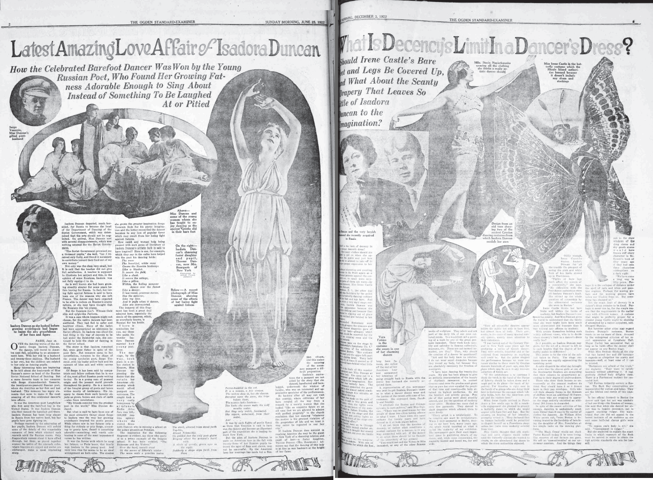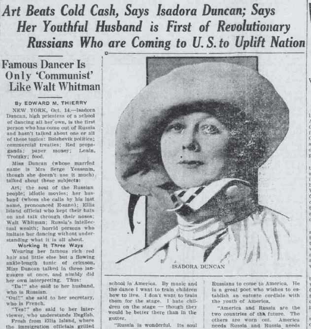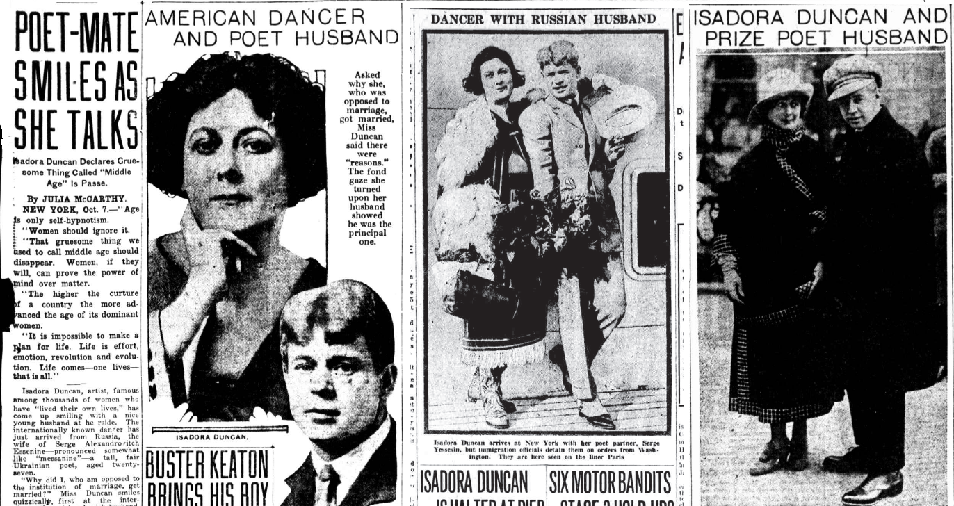 Владимир Абаринов: Насколько я понимаю, Айседора сама сорвала себе гастроли своим политическим темпераментом – несмотря на предупреждения импрессарио Сола Юрока, она не могла удержаться от политических монологов, восхваляющих русскую революцию, и этим навлекла на себя гнев публики, не говоря уже о фривольных нарядах, с трудом допустимых в Нью-Йорке, а уж в провинции и подавно. А тут еще и Есенин впадает в депрессию и скандалит. И вот тогда в его отношении к Америке появляется традиционный мотив американского мещанства, американского провинциализма, характерный и для других советских визитеров. Особенно Маяковский потом эту тему разовьет: мол, небоскреб новый, а клопы в нем те же самые.