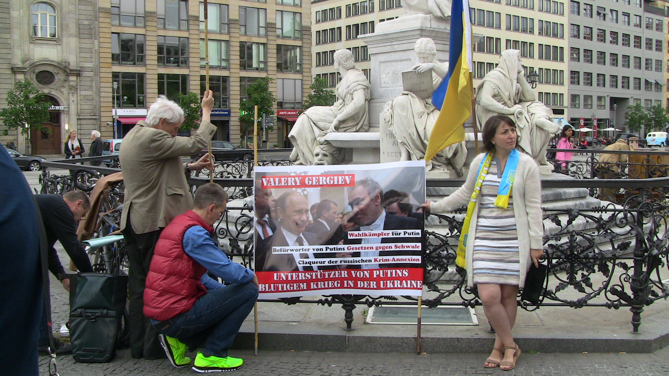 Демонстранты, среди которых были граждане Германии, США и Украины выкрикивали призывы к собиравшейся на концерт публике бойкотировать его, так как Гергиев является приверженцем политики российского президента Владимира Путина и, стало быть, поддерживает российскую агрессию и "братоубийственную войну" на Украине.
