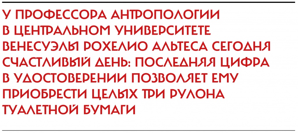У профессора антропологии в Центральном университете Венесуэлы Рохелио Альтеса сегодня счастливый день: последняя цифра в удостоверении позволяет ему приобрести целых три рулона туалетной бумаги. Но сделать быстро это не получится — таких страждущих, как он, несколько сотен. Стражник на дверях запускает по несколько десятков человек в предбанник супермаркета, а потом внимательно изучает документы каждого. «Вы думаете, у меня нет других занятий, — чуть не плачет профессор Альтес. — Ведь сколько всего я мог бы сделать за это время. Сессия заканчивается, меня ждут студенты, а я чем занимаюсь?»