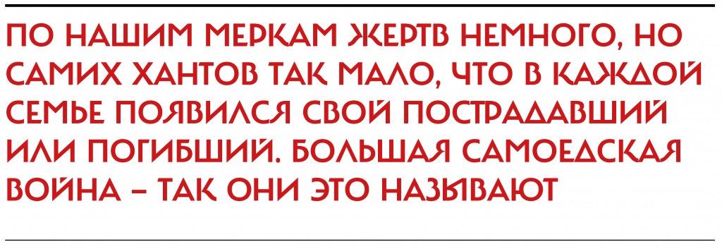 А почему убили? Боги сказали, что надо принести чужих в жертву. Это, собственно, и назвали восстанием. К хантам прислали карательный отряд, они оборонялись, построили ледяную крепость. В перестрелке были убиты два человека из отряда и двое хантов, а потом начались репрессии: самолет садился рядом с чумом, хозяина забирали в суд, били его палками, отнимали оленей и ружья. В таких стычках погибли человек пятнадцать, а еще сорок погибли во время следствия, в тюрьме, при допросах. И хотя по нашим меркам жертв немного, но самих хантов так мало, что в каждой семье появился свой пострадавший или погибший. Большая самоедская война — так они это называют.
