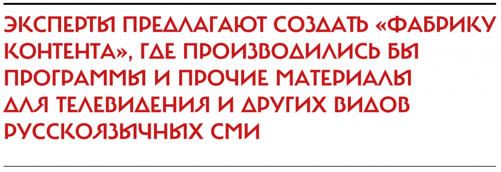 В результате эксперты пришли к первому и главному выводу: развивать новый телепроект на одной-единственной платформе нецелесообразно. Вместо этого они предлагают создать «фабрику контента», где производились бы программы и прочие материалы для телевидения и других видов русскоязычных СМИ. Кроме того, в перечне экспертных рекомендаций — создание центров инфообмена и обучения журналистов. Финансированием всех этих проектов займется фонд, в котором будут аккумулироваться средства от различных доноров, что позволит оказывать помощь не только государственным, но и коммерческим русскоязычным СМИ, а также любым стартапам.
