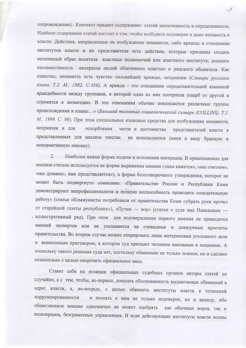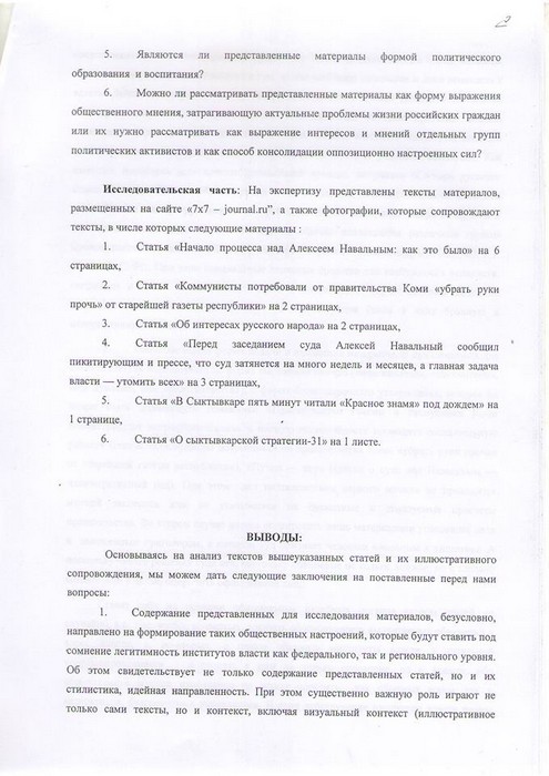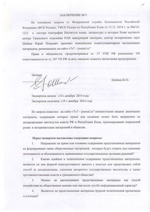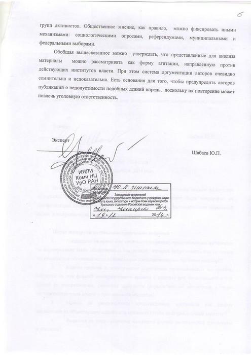 Как следует из документов, представленных ведомством, в декабре 2014 года по запросу УФСБ России по Коми заведующий сектором этнографии Института языка, литературы и истории Коми научного центра УрО РАН Юрий Шабаев провел экспертизу шести материалов, опубликованных на сайте в 2014 году.