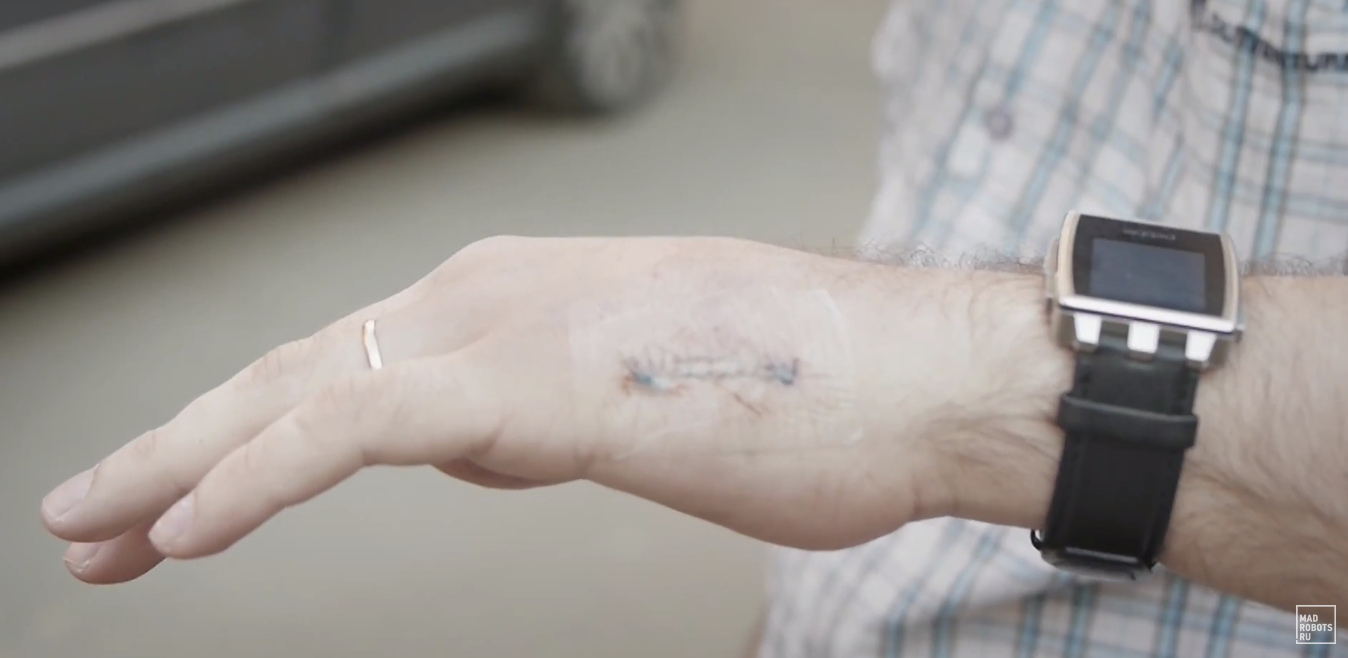 According to Madrobots.ru’s YouTube video, Zaitsev cut open his left hand with a scalpel, inserted the computer chip from his Moscow subway “Troika” card, and sewed up the incision.