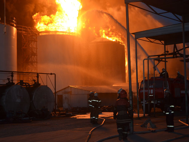 "Васильковский пожар: на утро полностью выгорело четыре емкости (с нефтепродуктами. - Прим. NEWSru.com). Горение по-прежнему локализовано. Расчеты пожарных контролируют периметр", - написал министр в своем микроблоге в Twitter.