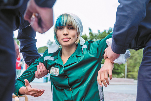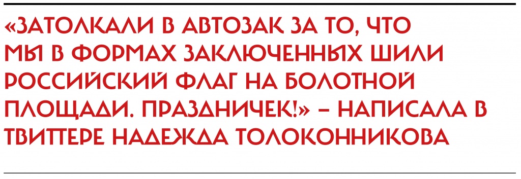 В День России участницу группы Pussy Riot Надежду Толоконникову и Катрин Ненашеву задержали на Болотной площади в ходе акции в поддержку заключенных женщин. Во время перформанса они были одеты в тюремную робу и планировали сшить российский флаг, но успели лишь разложить ткань.