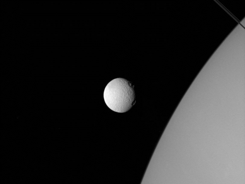 НАСА опубликовало новую фотографию спутника Сатурна Тефии, сделанную широкоугольной камерой космического аппарата Cassini 11 апреля 2015 года. Снимок был сделан с расстояния 120000 километров от Тефии.