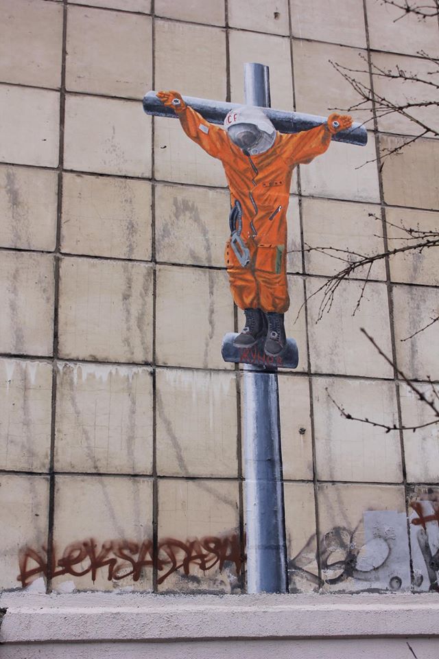 В ночь на 12 апреля Александр Жунев на одном из зданий в центре Перми изобразил космонавта Юрия Гагарина, распятого на кресте. Причиной такой комбинации образов стал День космонавтики, совпавший в этом году с Пасхой. 30-летний художник считает, что такое стечение обстоятельств символично, поскольку наука и религия долгое время противостояли друг другу.