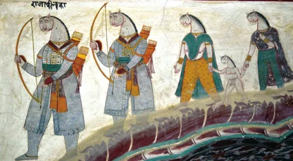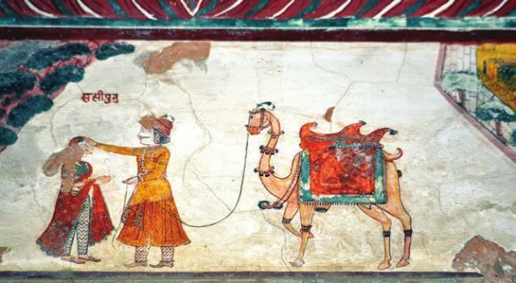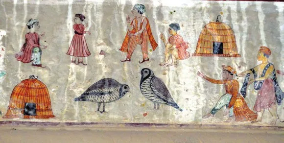 Поразила неожиданная эклектичность сюжетов. Сцены индийского эпоса («Махабхарата») перемежаются видами европейских городов и фантастическими картинами из жизни соседних азиатских стран. Растительные орнаменты, напоминающие украшения дворцов периода Великих Моголов, удивительным образом соседствуют с изображениями людей и животных. Рядом с руинами дворца сохранился княжеский сад с довольно странным составом растительности. На лужайке цвели лилии. Вместе с тропическими бугенвиллеями, рододендронами, пальмами росли одинокая опунция и пара араукарий. На ее стволе, опутанном лианой, заметили странную вязь белых нитей, напомнившую орнитологу совиный пух. Однако когда мы попытались прикоснуться к ним, эти «пушинки» неожиданно начали складываться, а затем в прыжке распались. Возможно, это был один из видов цикад.