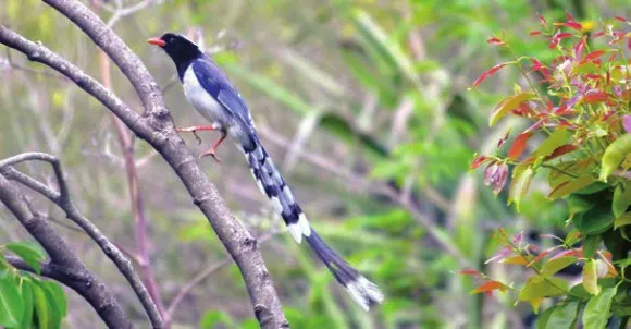 На рассвете орнитолог обследовал ближайшие окрестности селения. Сухие и довольно крутые склоны холмов были покрыты густыми зарослями колючих кустарников. Среди них группами возвышались молочаи, акации и сосны. Тем не менее место оказалось весьма интересным. У гнезда с птенцами беспокоилась пара красноклювой голубой сороки (Urocissa erythrorhyncha) , эндемичного вида северо-западной Индии.