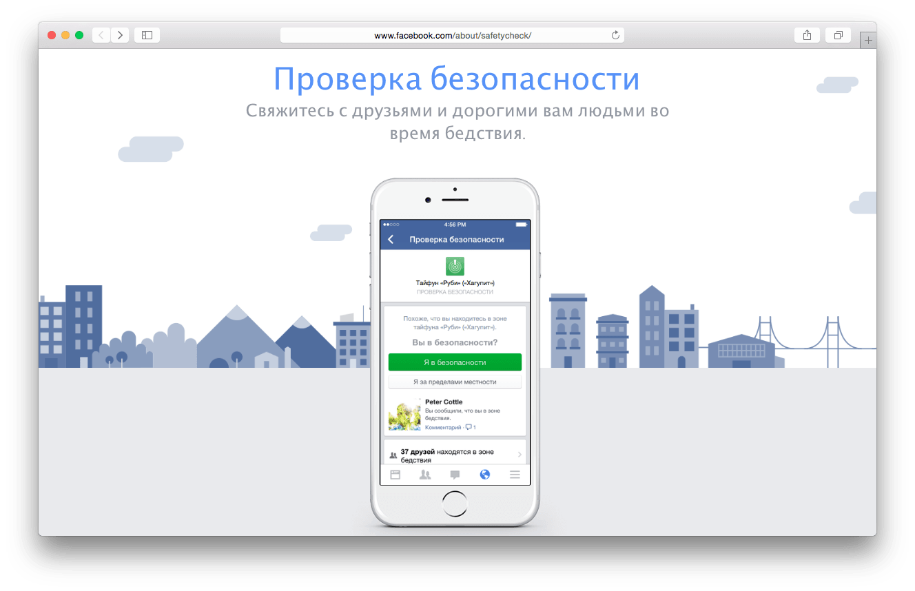 Если похоже, что поблизости происходит стихийное бедствие, Facebook спросит пользователя, в безопасности ли он. Если с вами все в порядке, следует нажать на кнопку «Я в безопасности», чтобы немедленно сообщить об этом друзьям и близким.